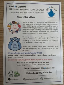 Bag2school is a textile recycling company who collects unwanted textiles diverting them away from landfill and raising vitally needed funds for Ysgol Golwg y Cwm.